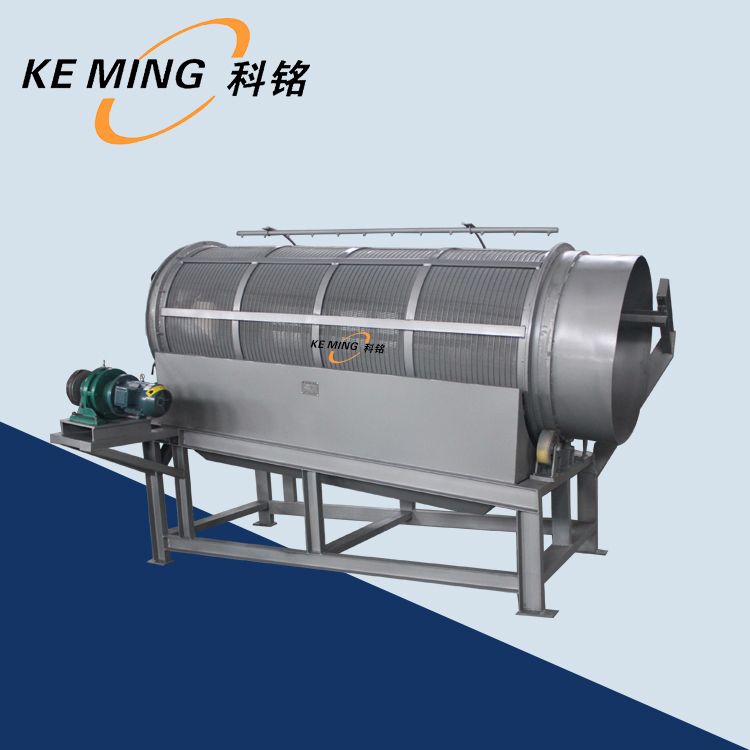 滾筒裝置傾斜安裝于機架上。電動機經(jīng)減速機與滾筒裝置通過聯(lián)軸器連接在一起,驅(qū)動滾筒裝置繞其軸線轉(zhuǎn)動。當物料進入滾筒裝置后,由于滾筒裝置的傾斜與轉(zhuǎn)動,使篩面上的物料翻轉(zhuǎn)與滾動,使合格物料(篩下產(chǎn)品)經(jīng)滾筒后端底部的出料口排出,不合格的物料(篩上產(chǎn)品)經(jīng)滾筒尾部的排料口排出。由于物料在滾筒內(nèi)的翻轉(zhuǎn)、滾動,使卡在篩孔中的物料可被彈出,防止篩孔堵塞。